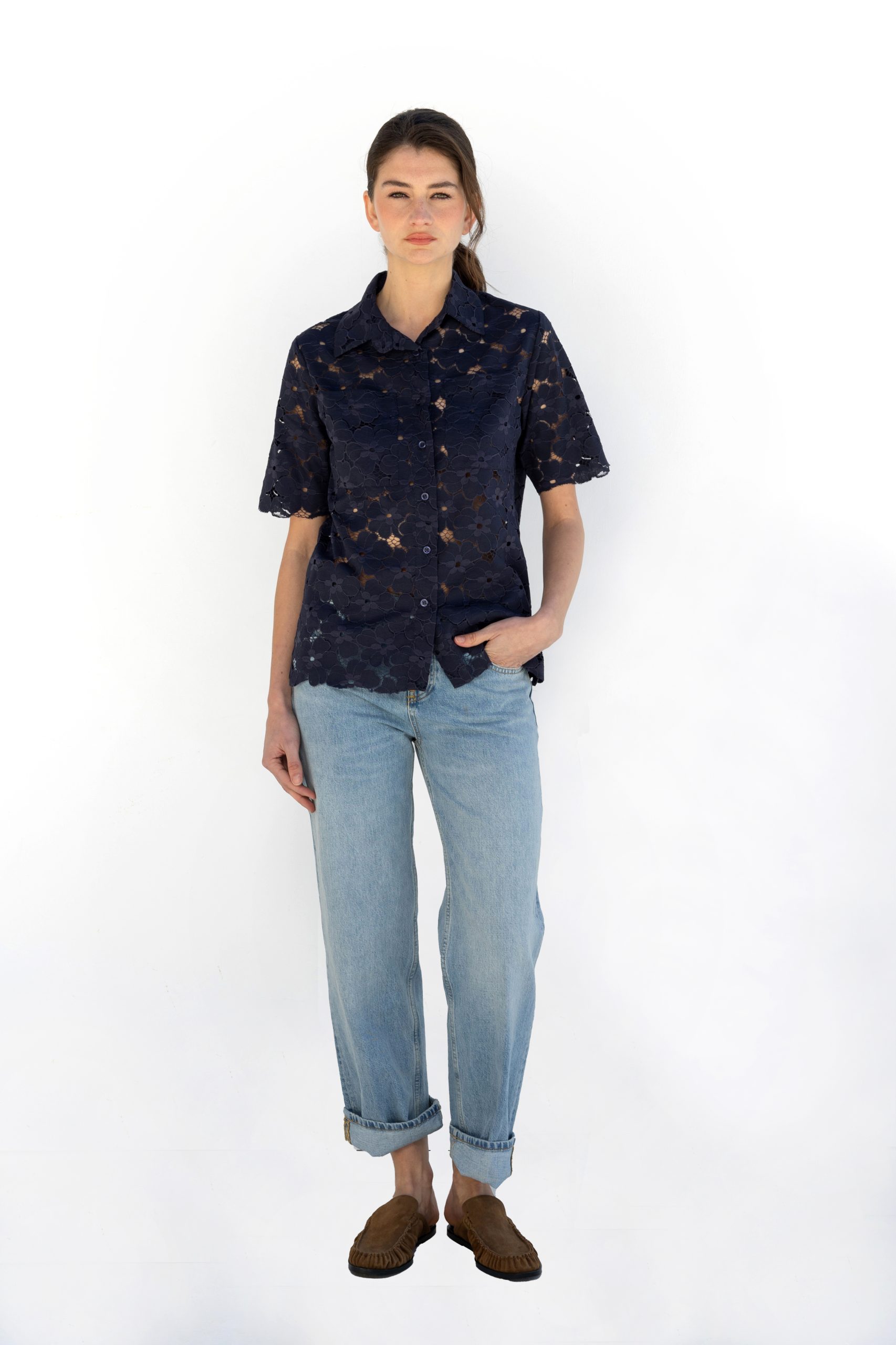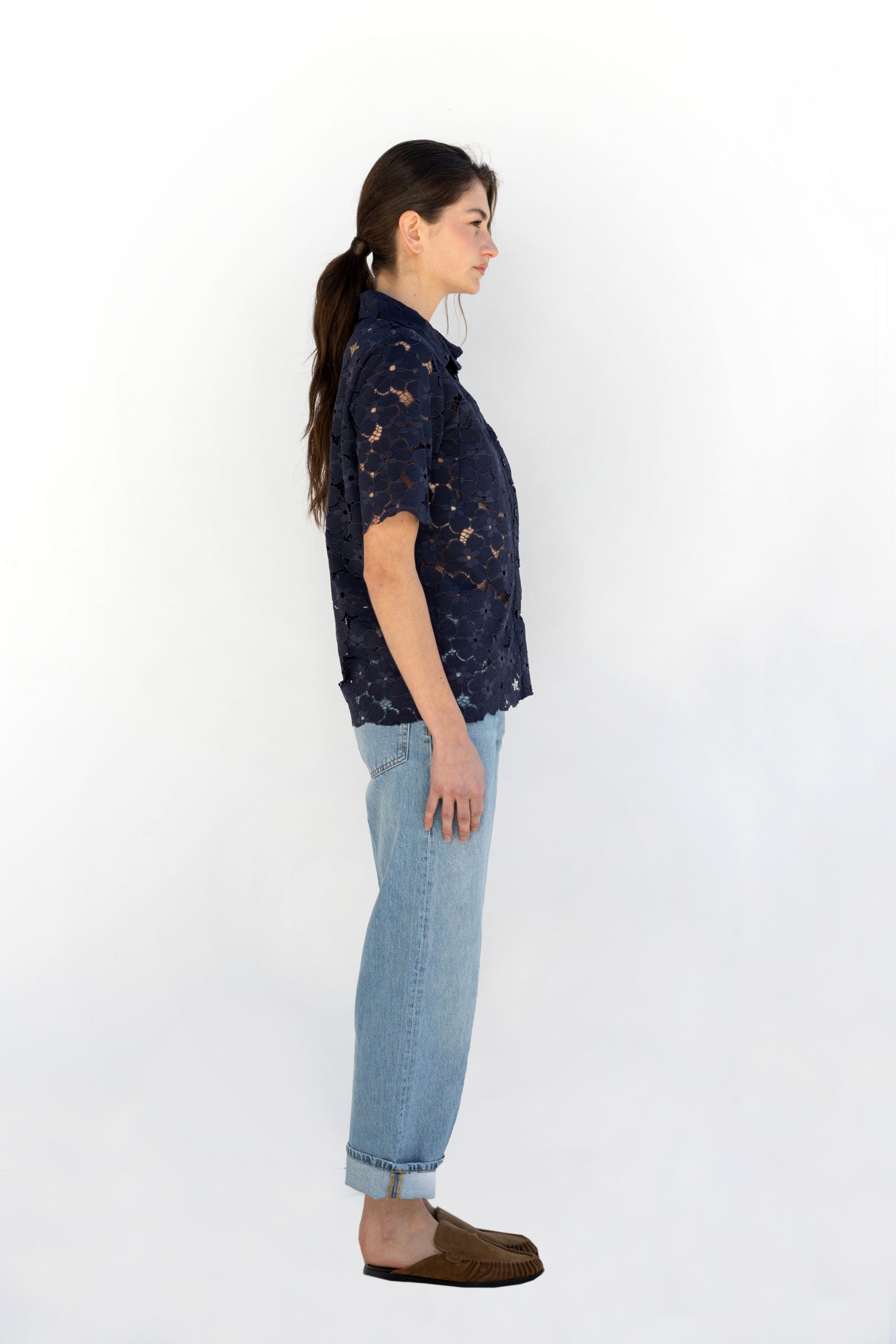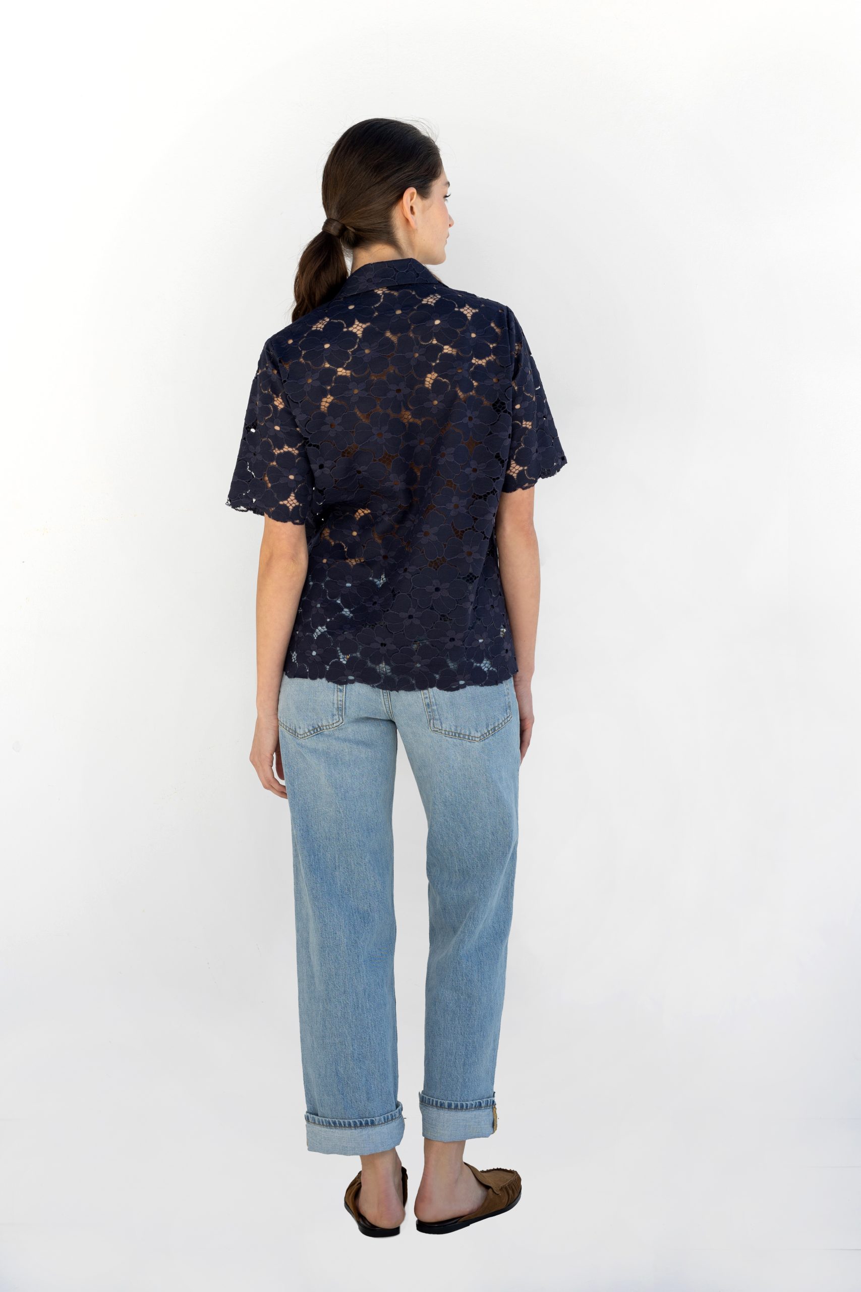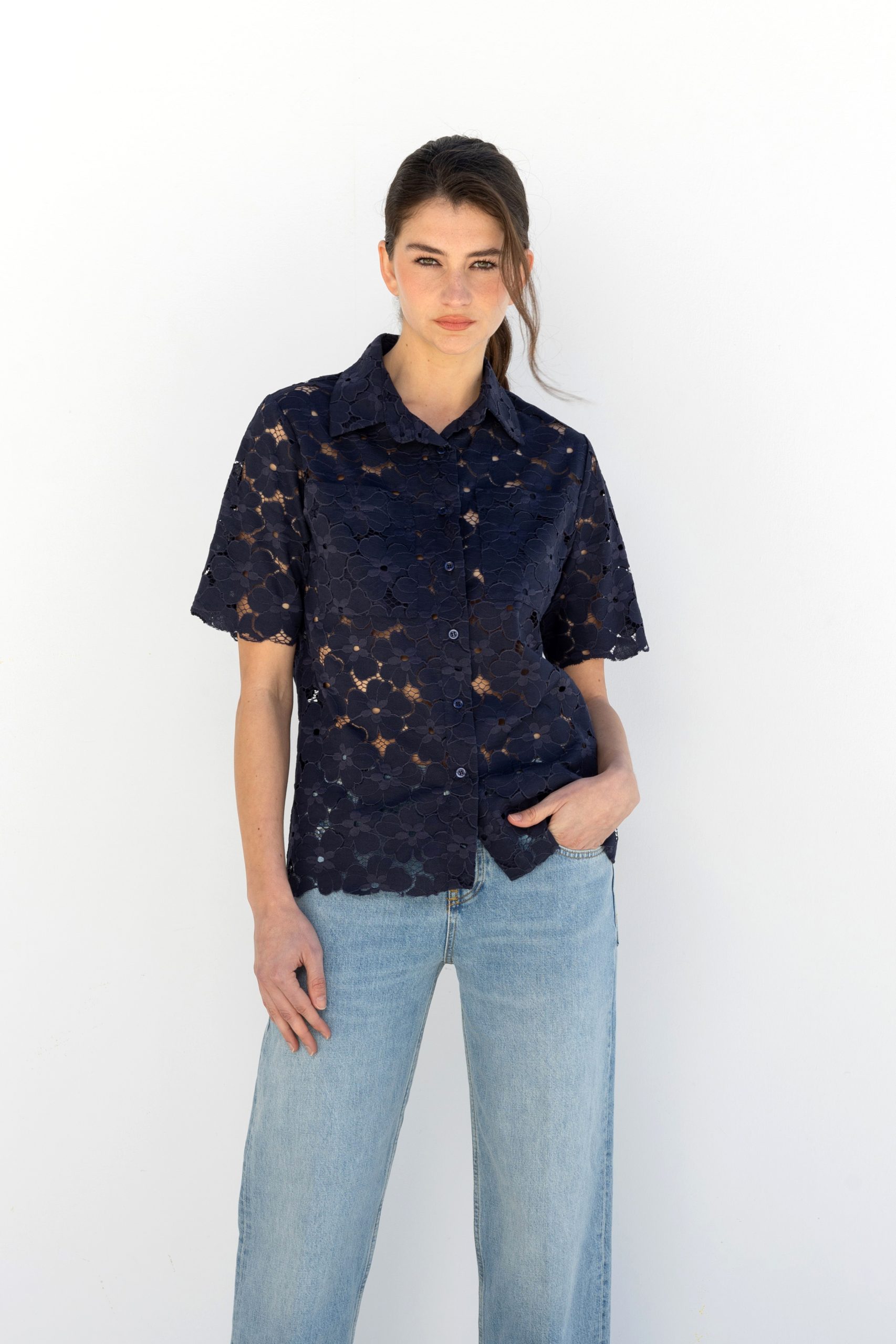 Dark blue semi-sheer lace shirt with relaxed fit and minimal aesthetic.