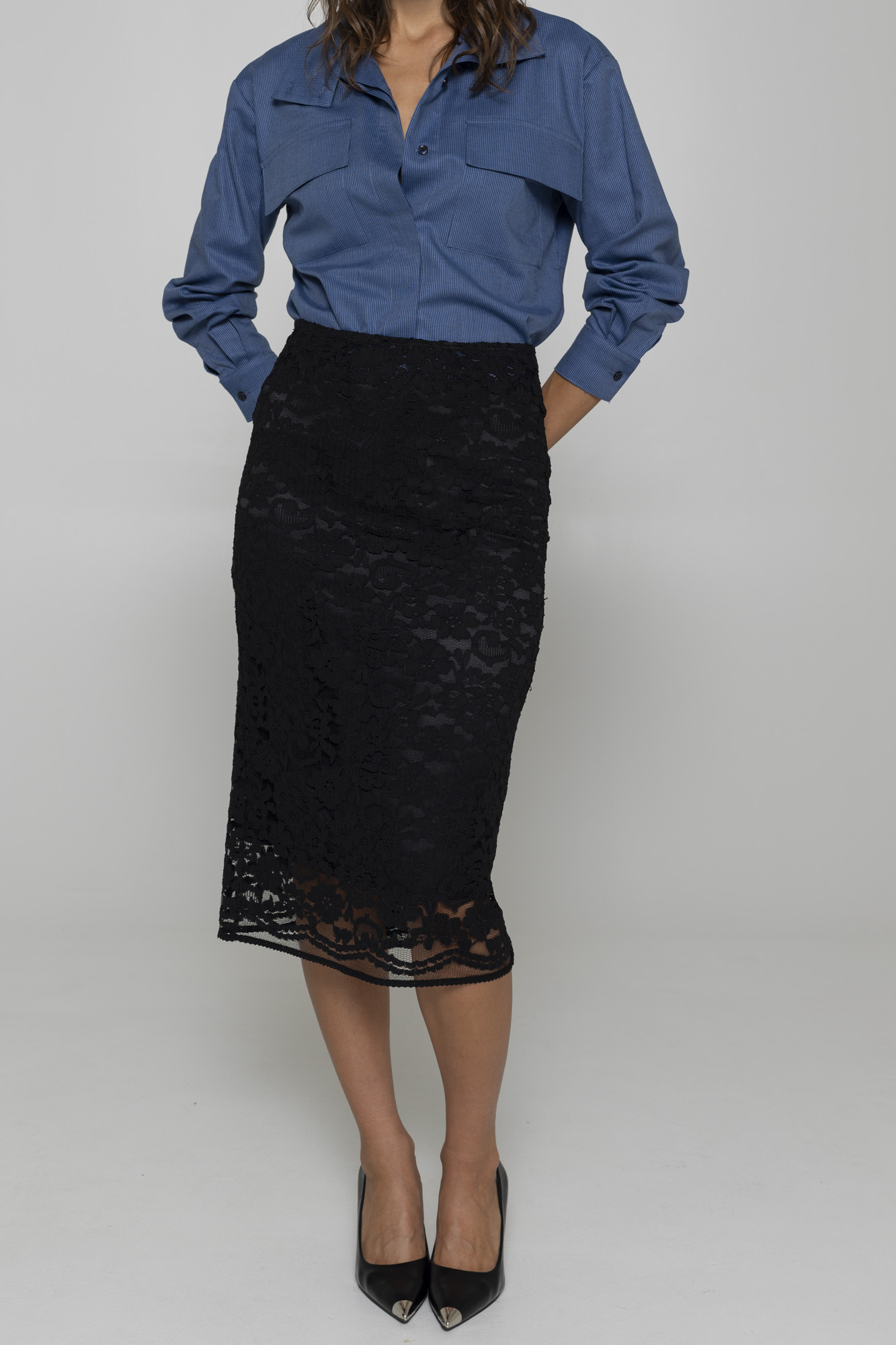 Romantic lace midi skirt with pure silk lining. Feminine and timeless, perfect for chic evening looks.