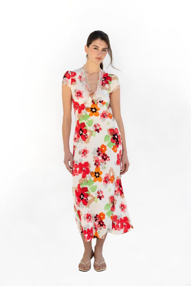 Multicolour floral midi dress crafted from 100% viscose with a soft loose silhouette, delicate nude lace neckline and adjustable cord detail. Finished with a discreet side zipper for an elegant feminine look.